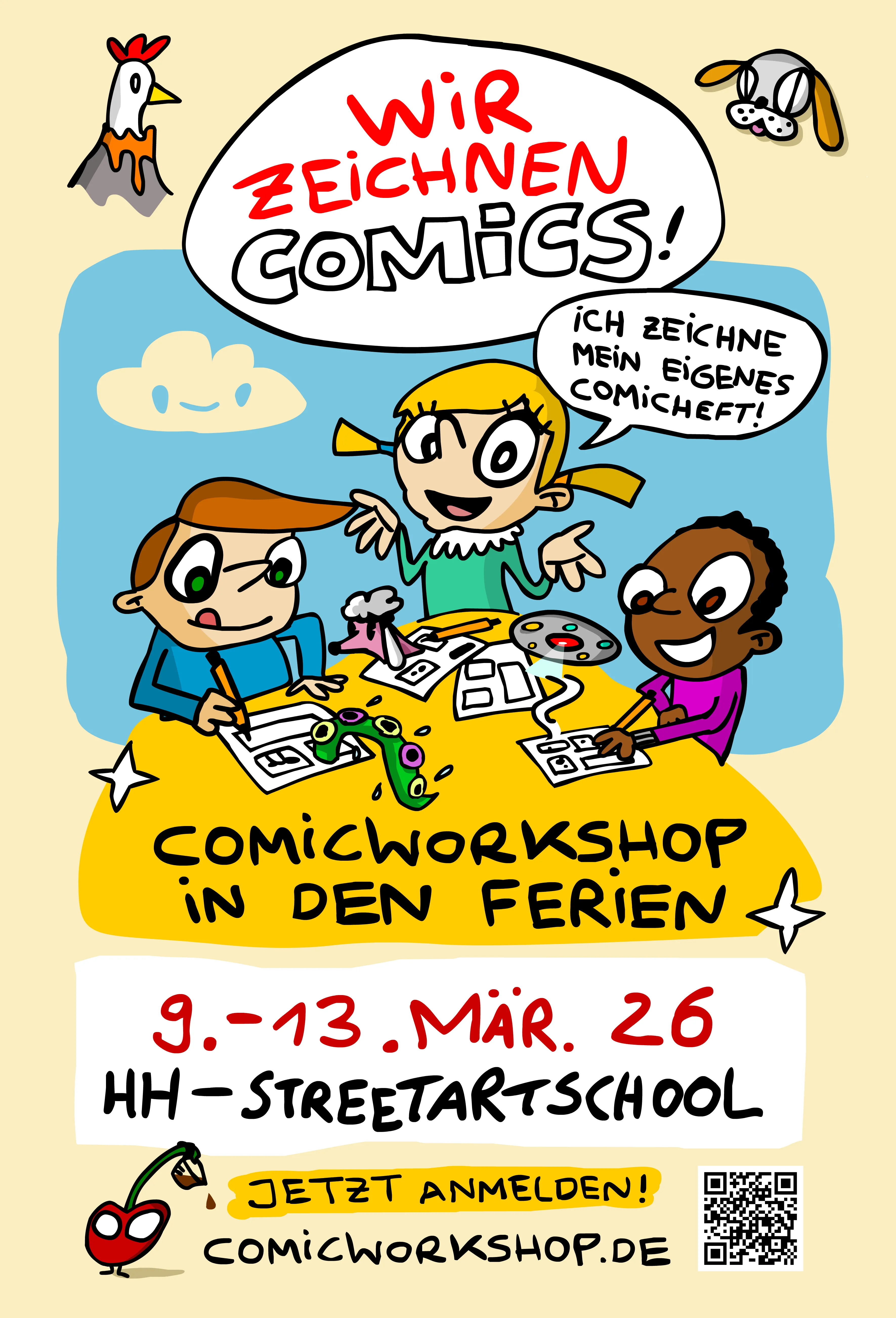 "Wir zeichnen gemeinsam Comics!" - "Und wenn mir die Ideen ausgehen?" - "Dann bündeln wir unsere Brain-Power und schaffen es zusammen!" - "Sind die anderen nicht viel besser als ich?" - "Nein, alle arbeiten ja an unterschiedlichen Geschichten. Und jedes Kind hat sein eigenes Tempo." - "Ist es laut und hektisch?" - "Meistens nicht. Wir konzentrieren uns auf unsere Comics. Wir reden und zeichnen richtig viel. Viele ulkige, quatschige Sachen, die verrückte Personen erleben!" - "Hmm... also, keine Zeit für Langeweile?" - "Genau!" Wir nehmen uns 5 Vormittage Zeit und denken uns unsere neuen Comics selbst aus. 1 Workshopleiter und 8 Kinder und jede Menge Spaß. Das alles in der Street Art School in St. Pauli. Macht mit!