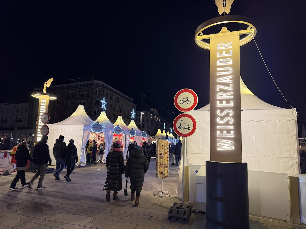 Seit nunmehr 18 Jahren gehört der Weißerzauber am Jungfernstieg fest zur Hamburger Vorweihnachtszeit. Direkt an der glitzernden Binnenalster gelegen, verbindet dieser Weihnachtsmarkt stilvolle Architektur, festliche Lichtkunst und das besondere Flair des Hamburger Prachtboulevards.